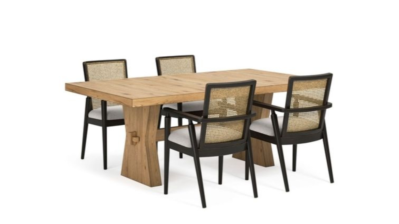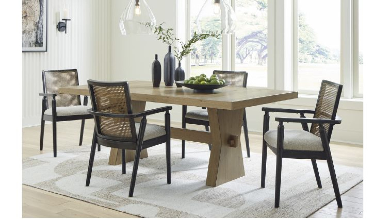 Galliden  -ის სასადილო ოთახის მაგიდა წარმოდგენილია თანამედროვე სტილის დიზაინით, ღია ყავისფერ ტონალობაში. ხის ზედაპირი გაფორმებულია ე.წ მსუბუქი “ფხაჭების” დიზაინით. მთლიანი კონსტრუქცია დამზადებულია მასიური ხისა და ტექნიკური ხის კომბინაციით.