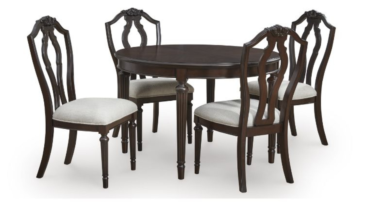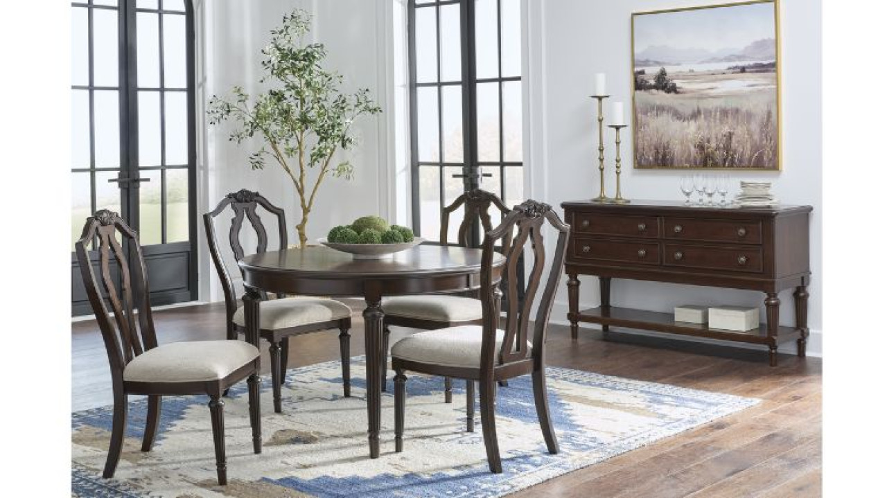 Lavinton  თანამედროვე კლასიკური სტილის სასადილო გასაშლელი მაგიდა . მუქი ყავისფერი მასიური ხისა და ტექნიკური ხის კომბინაციით. დახურულ მდგომარეობაში დიამეტრი არის 1.21 სმ და გაშლილ მდგომარეობაში 1.82 სმ