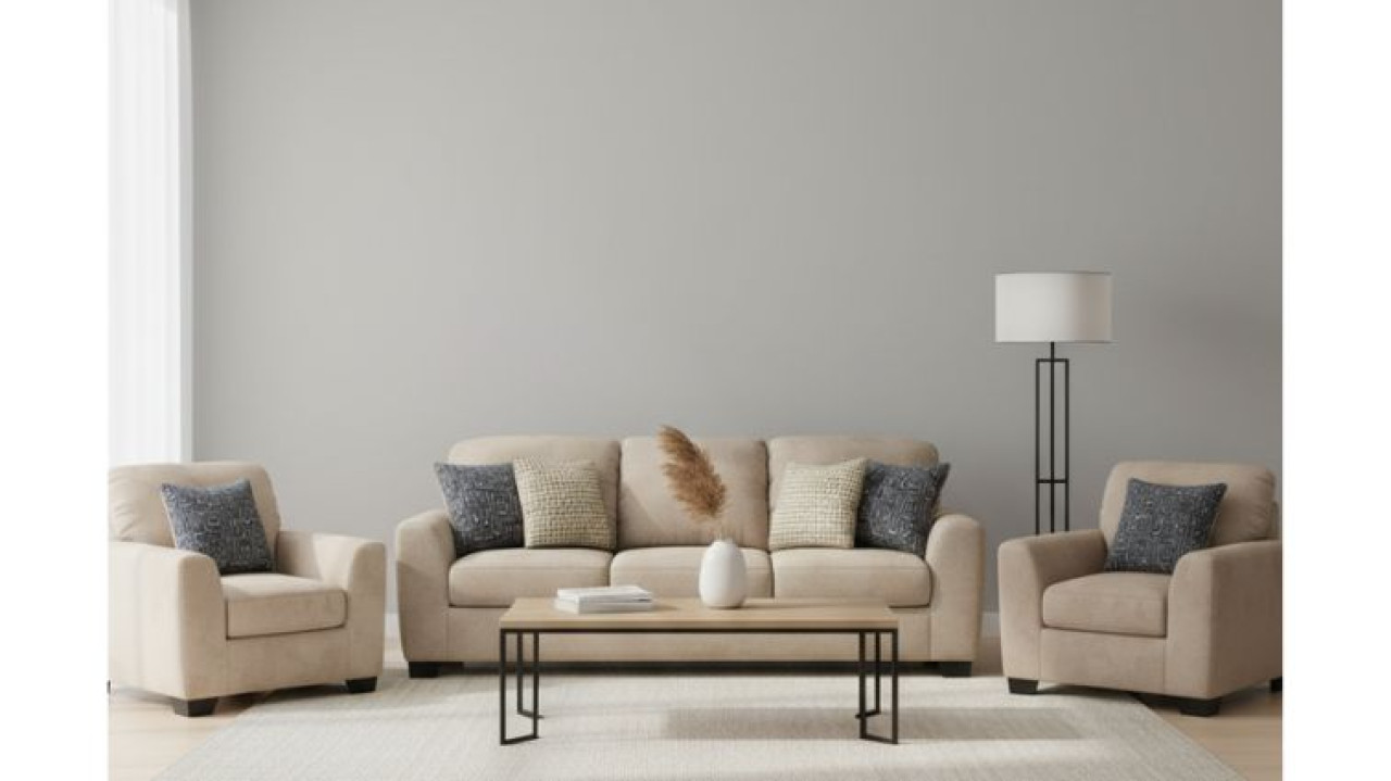 თანამედროვე სტილი თქვენი სახლის ინტერიერში, ქსოვილი დაფარულია მჭიდროდ ნაქსოვი პოლიესტერით.დიზაინი წარმოდგენილია ღია ფერში ,კომპლექტში გვხვდება დივანი, და ორი სავარძელი