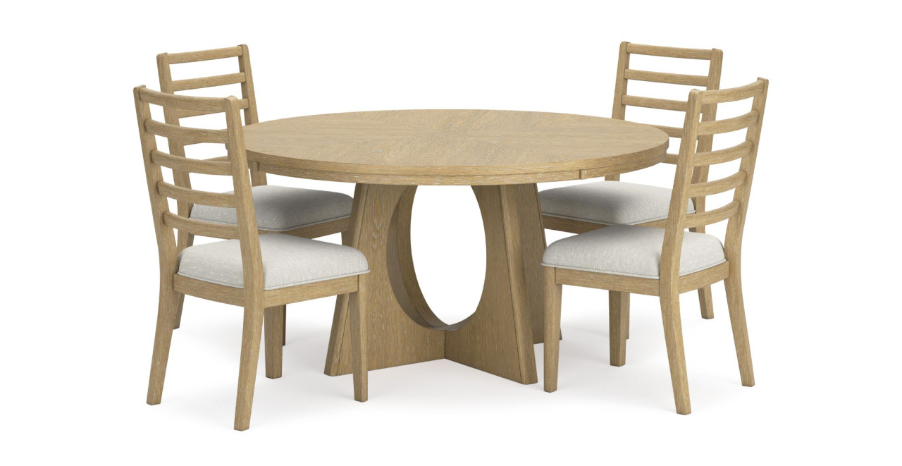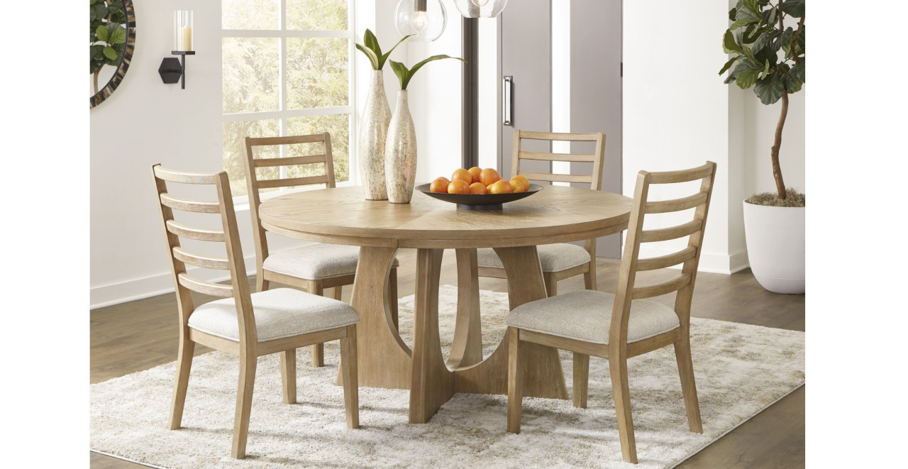 Rencott -თანამედროვე სტილის სასადილო მრგვალი  მაგიდა ,რომელიც დამზადებულია მასიური ხის და აკაციის ხის ანათალის კომბინაციით.
