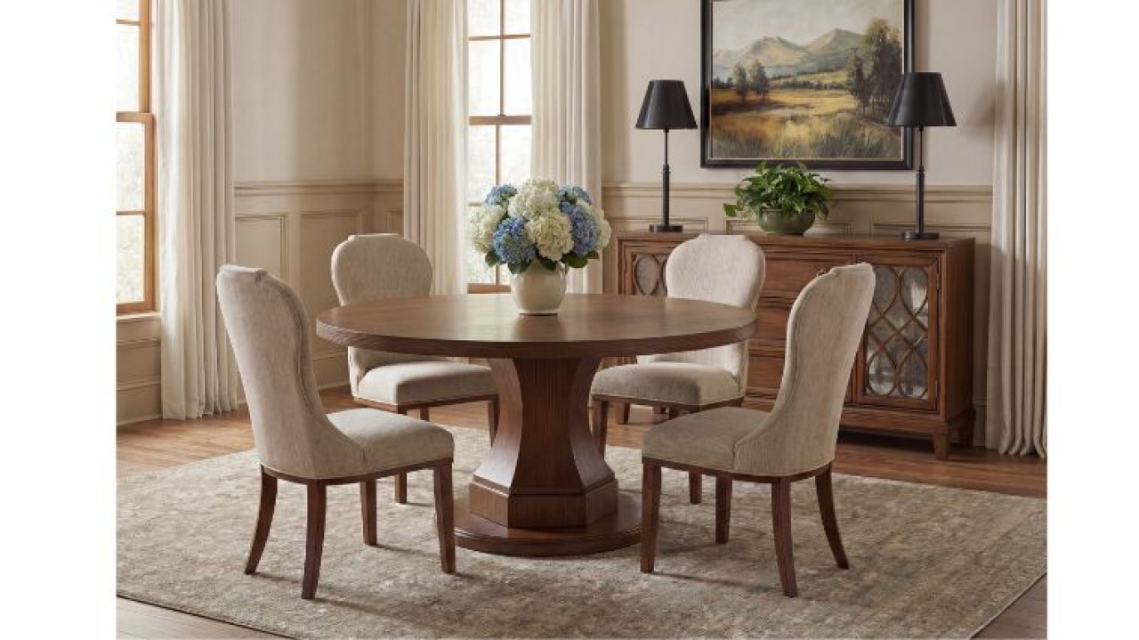 მრგვალი მაგიდა jorlaina- , რომელიც დამზადებულია მასსიური ხის და აკაციის ხის ანათალის კომბინაციით,ორი ფერის კომბინაცია,რომელიც დამატებით იერს მატებს მაგიდას