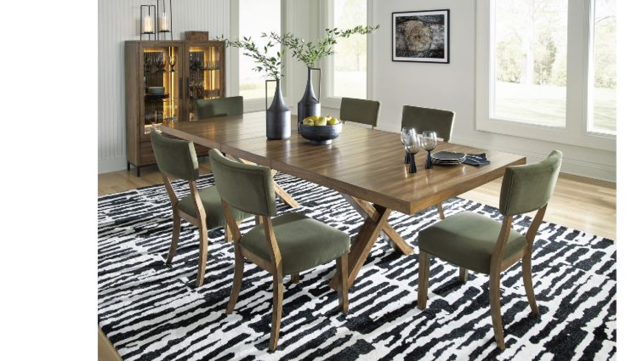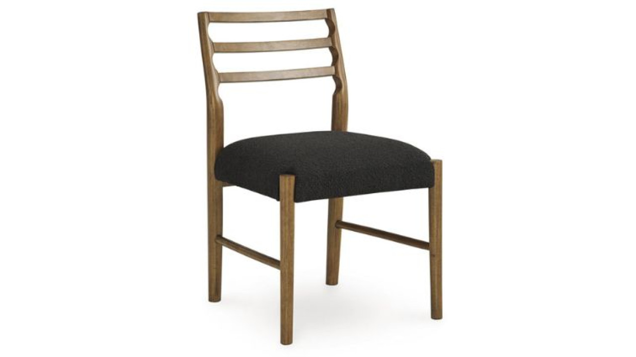 თანამედროვე სტილის სასადილო სკამი. დამზადებულია ღია ფერის მასიური ხისა და ტექნიკური ხის კომბინაციით. დასაჯდომი ნაწილი შედგება მაღალი ხარისხის ღრუბლისა და მუქი ფერის პოლიესტერის ქსოვილისგან.