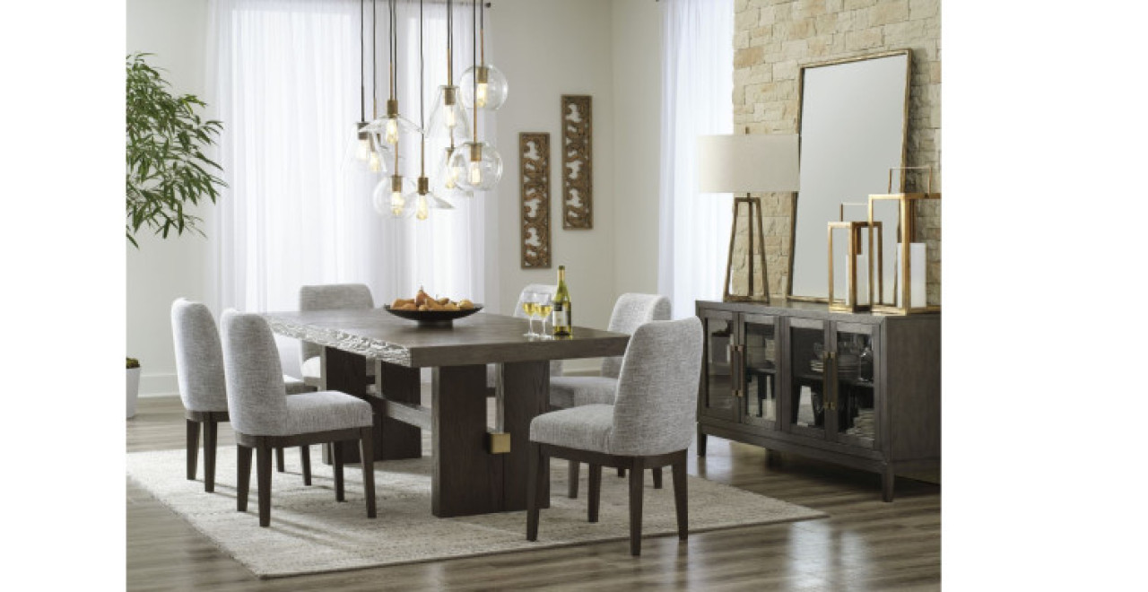 Burkhouse-ის თანამედროვე კლასიკური სტილის სასადილო სკამი. დამზადებულია მუქი ფერის მასიური ხისა და ტექნიკური ხის კომბინაციით, დასაჯდომი და საზურგე ნაწილი მაღალი ხარისხის ღრუბლისა და ღია ნაცრისფერი ქსოვილისგან შედგება.