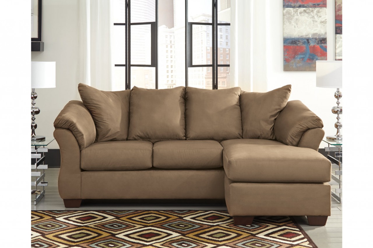 Talk about fine lines and great curves. That’s the beauty of the Darcy sofa chaise—made to suit your appreciation for clean, contemporary style. A striking flared frame, comfy pillow top armrests and an ultra-soft upholstery that holds up to everyday living complete this fashion statement. Versatile chaise has a movable ottoman and reversible cushion and can be used on right or left side.