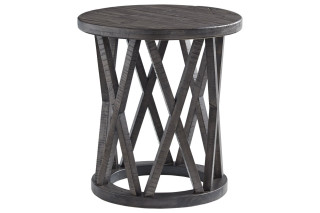 Make it bold and beautiful when you round up the rustic style of the Sharzane end table. You'll love the casual look that's delivered through its transitional design. A drum shape with repeated "X" motifs form a unique base and the round top has a planking effect full of detail in a weathered finish. Saw kerf detailing adds notable character to each of the "X" motifs in the table's base—what a plus for creating a relaxed, rustic setting in your living area.